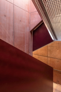 Im Inneren des Treppenhauses haben Heneghan Peng Architects die Betonfertigteile roh belassen und mit Einbauten aus dunkelroten Metall kombiniert. Im Kontrast dazu sind der große Haupteingang sowie bodentiefe Seitenfenster im Erdgeschoss des Altbaus mit anthrazitfarbenen Einbauten versehen. Diese neuen Durchbrüche sollen den alten Fabrikbau zur Straße öffnen und die Aktivitäten des Museums im öffentlichen Raum sichtbar machen – die Gestaltung der Umgebung stammt vom Büro AG Freiraum. Dank des Treppenhauses ließ sich der Zugang zum Stadtmuseum repräsentativ zur Straße verlegen, was eine wichtige städtebauliche Bedingungen für die Umnutzung des Gebäudes war. (sj)