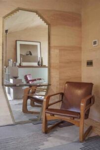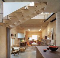 Koch- und Wohnbereich machen die volle Raumhöhe samt Verschneidungen erfahrbar und werden von Birken-Sperrholz dominiert. Der interne Zugang zum Studio liegt leicht versteckt zwischen Abstellkammer und WC – das von den Architekt*innen liebevoll als „powder room“ bezeichnet wird. Der Schlafbereich samt Bad ist über eine Galerie zu betreten – im Schnitt scheint es sogar so, als könne man von hier direkt aufs Dach gelangen und dank der liegestuhlförmigen Fläche den meilenweiten Ausblick in den Bundesstaat New York genießen. (tg)