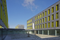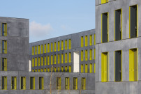 Die Häuser sind als Stahlbetonmassivkonstruktionen gebaut. Sie haben eine Hülle aus dunkel durchgefärbten Sandwichelementen. Noch einmal die Architekten: „Diese robusten Fassadenelemente aus Architekturbeton changieren in ihrer Farbe und erzeugen eine lebendige Hülle, deren Wirkung durch den Kontrast zu den tiefen Fensterlaibungen mit gelbgrünen eloxierten Blech- und Faltschiebeläden verstärkt wird.“ – Das Wohnheim hat etwa 17 Millionen Euro gekostet.
