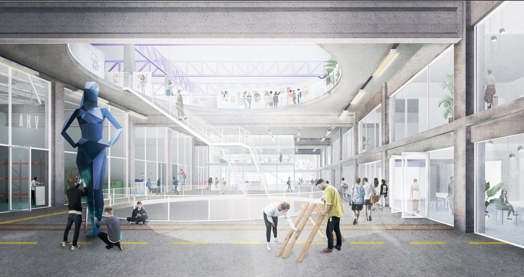 Früher Postverteilzentrum, heute Hochschule, und in Zukunft kulturelles Zentrum eines neuen Wohn- und Geschäftsquartiers: Etwa 80 Kilometer südöstlich von Amsterdam soll der Umbau eines Bestandsgebäudes das Herzstück eines geplanten Stadtteils werden. KuBus heißt das ambitionierte Projekt vom Amsterdamer Architekturbüro Studioninedots und DELVA Landscape Architecture|Urbanism (beide Amsterdam). KuBus steht hier für „Kunst” und „Business”. Die Planer*innen möchten neben dem Umbau des ehemaligen Postverteilzentrums mehrere turmartige Neubauten auf dem Gelände realisieren und zudem Grünflächen und ein offenes Flussufer in das zu entstehende Quartier einbinden.