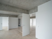 In diesem Sinne verstehen die Architekt*innen Anne Femmer, Juliane Greb, Petter Krag und Florian Summa das Gebäude als Infrastruktur für unterschiedliche Lebensstile. Alle fünf Geschosse folgen dem gleichen Grundraster: außen die Zimmer, in der Mitte des Baukörpers die Bäder und Küchen, über die auch erschlossen wird. Es gibt keine definierten Flure, Abstellräume oder Kinderzimmer. An der Decke zeichnen Unterzüge das Grundraster der 14 Quadratmeter großen Raumeinheiten vor. Wie viele Wände gestellt werden, und wo Türen sein sollen, kann individuell entschieden werden. Zimmer können hinzugeschaltet, an die Nachbar*in abgegeben oder geteilt werden. Mitunter sind drei oder vier Wohnungen über ein „Treppenzimmer“ verbunden, das zum Beispiel als Wohn- oder Spielzimmer, Büro oder Fitnessraum genutzt werden kann. Geschaltet wird über Türen, also ohne, dass eine Wand gestellt oder abgerissen werden muss. Damit kein Streit über die Energiekosten entsteht, kann der Verbrauch direkt am Heizkörper abgelesen werden.