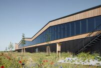 Im Eingangsbereich öffnet eine Pfosten-Riegel-Glasfassade mit einem Rankgerüst den Baukörper. In diesem Schwellenraum zwischen innen und außen ist auf zwei Ebenen das Café untergebracht. Eine neben der Halle angelegte Streuobstwiese mit Lehrpfad, hölzerne Solar-Carports auf dem Parkplatz, ein Regenwassermanagement mit Mulden und Rigolen sowie eine intelligente Gebäudeautomation ergänzen das Klimakonzept. Die Freiraumplanung lag bei Kriewald Landschaftsarchitektur aus Magdeburg. (da)