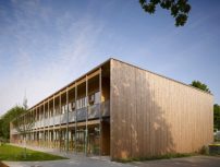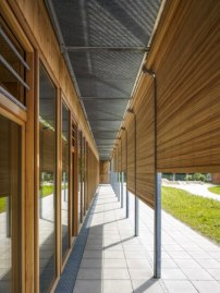 Das Grundstück für diese zweigeschossige Kita in Frankfurt-Rödelheim grenzt an eine bestehende Schule. Auch hier sind sechs Gruppen untergebracht, die mit jeweils einer Terrasse oder einem Balkon einen direkten Außenbezug über eine raumhohe Verglasung mit Drehflügeln haben. Jeder Gruppe ist ein Garderobenbereich vorgelagert, der mit natürlichem Licht von oben versorgt wird. Der Sonnenschutz erfgibt sich durch Balkon- und Dachüberstand und wird durch außenliegende Holzlamellen-Jalousien ergänzt. Die Konstruktion steht auf einer Stahlbetonplatte und besteht aus vorgefertigten, gedämmten Holzelementen.