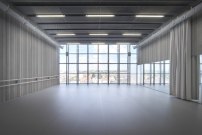 Simpel ist die Geometrie, linear die Raumorganisation und minimalistisch die Ausstattung der Tanzschule: Für Treppen, Fensterrahmen, Türen und Deckenverkleidung setzten Lankry Architectes Metall ein, Boden und Wände sind aus Beton. Aufwändiger hingegen ist die Fassade. Eine Hülle aus perforiertem Metall ist dem Bau vorgehängt. Ihre Faltung formt ein durchgehendes Rautenmuster auf der Fassade. Die Architekten, die sich sonst auf die Einfachheit ihres Baus stützen, sprechen in der Pressemitteilung nicht von Rauten, sondern von „Diamanten“ und sehen die Metallhülle als „feines Gewebe“, das den Bau zur „Skulptur“ adelt. Gleich welche Worte sich für diese Fassade finden lassen, die Message ist eindeutig: Das 2,4 Millionen-Euro-Projekt soll eine Landmarke sein. (sj)