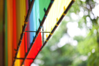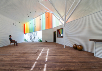 Eine Stahl-Baumstütze ist das einzige konstruktive Element, das im Inneren sichtbar ist. Das Gebäude besteht aus einem einzigen Innenraum. Farbige Vorhänge in mehreren Schichten vor den Öffnungen sorgen für farbliche Akzente in dem ansonsten rein weiß gehaltenen Raum. Fußboden und Möbel bestehen hingegen aus Holz. – Die „Kapelle“ wurde im Juni fertig.
