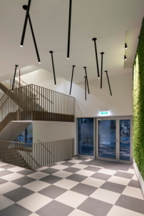 Das 4.510 Quadratmeter große Wohn- und Apartmenthaus mit gewerblicher Nutzung wurde auf einem Grundstück mit 2.174 Quadratmetern konzipiert. Das üppig begrünte Gebäude macht seinem Namen alle Ehre: Vom mit Bäumen bepflanzten Freibereich im Hofraum windet sich eine grüne Bahn, die entlang der geschwungenen Fassade ansteigt und auf dem Weg nach oben die allesamt bepflanzten Terrassen verbindet und schließlich in einer zentralen Dachterasse mit Blick über den See mündet. Katze müsste man hier sein, steht den Vierbeinern doch damit nicht nur eine schnöde Katzentreppe, sondern eine wahre Katzenautobahn, die alle Stockwerke in mäßiger Steigung verbindet, zur Verfügung: Ein wahres Copenhill für Katzen.