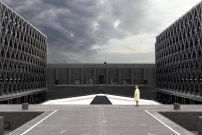 Der Anschein eines massiven Baukörpers täuscht, das Theater besteht aus einzelnen Volumen, die von einer Außenmauer zusammengefasst werden. So entstehen schmale Gänge und Zwischenräume, die auch das öffentlich zugängliche Stadtplateau auf dem Dach der Verwaltung erschließen. Auch hier erinnert Rizzis Architektur an historische Vorbilder, an Kirchenbauten oder die labyrinthischen Wege archaischer Tempelanlagen.