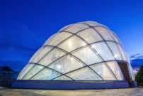 Das Tragwerk besteht aus jeweils zehn Stahlbögen, die sich um eine Längs- und eine Querachse auffächern und so ein Netz aus unterschiedlich großen Viereck-Feldern spannen. Für diese plante und berechnete das Ingenieurbüro formTL (Radolfzell) eine Überdachung aus vorwiegend zweilagigen Folienkissen mit einer integrierten pneumatischen Verschattung: Durch Druckveränderung lässt sich die Lage der bedruckten Folien zueinander variieren. Das reduziert oder erhöht, je nach Bedarf, die Lichtdurchlässigkeit der Kissen und damit den Licht- und Wärmeeintrag ins Gebäude.