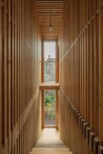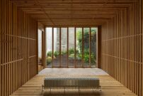 Innen überrascht das Haus mit einem fast schon fragilen, in der Masse jedoch robusten Holzgerüst: Balken und Stützen messen im Querschnitt lediglich drei mal drei Zentimeter. Dieses modulare System legt sich über Wände und Decke, verstärkt die bestehende Bausubstanz und soll für Erdbebensicherheit sorgen, so die Architekt*innen. Funktional wie ästhetisch prägt es das Raumgefühl.