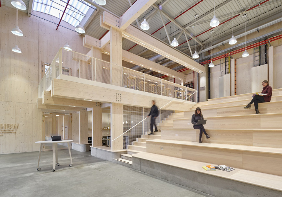 Formal verfremden beide Eingriffe den Bestand. Doch betonen die Architekt*innen, dass diesem mit dem nun nach unten geneigten Fassadenwinkel ein Stück seines defensiven Charakters genommen werde. Im Innenraum ließen sie Oberflächen erneuern und Sitzmöbel aus Holz hinzufügen. Der Umbau musste akribisch an den Hochschulbetrieb angepasst werden. Möglich wurde dies durch die Vorfertigung gleichartiger Segmente, die man sukzessive in die radiale Fachwerkstruktur des Bestands einließ. Gebaut wurde im Semestertakt, sodass während jeder Phase maximal ein Hörsaal außer Betrieb war. (tg)