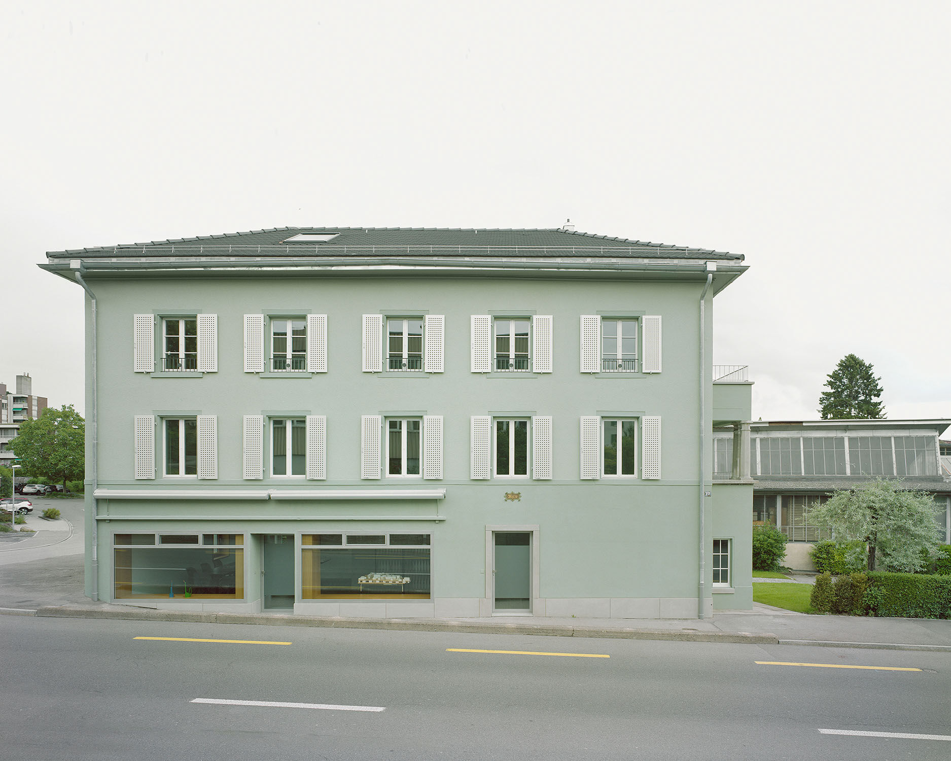 Nach außen zeigt sich der Bau mit einer Stuckfassade in Grün, die an historische Fabrikinnenräume erinnern soll. Die Fensterläden aus Aluminium sind eine Hommage an den von Hans Coray im Jahr 1938 entworfenen Landi-Stuhl, den die Blattmann Metallwarenfabrik einst produzierte.