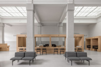Das harmonische Zusammenwirken verschiedener Zeitschichten setzt sich auch im Innenraum fort, wo aufgrund des Umbaus zur Diskothek nur noch wenig historische Substanz erhalten war. Die Architekt*innen arbeiten hier mit grauem Terrazzo, der in Form von Wand- und Stützenverkleidung auch in der Vertikalen wirkt. Die Decken konnten hingegen in ihrem originalen Zustand wiederhergestellt werden. Die gesamte Technik und die akustischen Elemente ließen sich unauffällig in den Ausbau integriert werden. Die Funktionen des Bürger*innenzentrums fanden wiederum in eingestellten Holzeinbauten Platz. Im Falle einer Konzertnutzung lassen sich diese mit wenig Aufwand verschließen beziehungsweise zu Seite schieben. (sb)