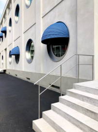 Neu hinzugekommen an den Fassaden sind die waschmaschinentrommelförmigen Fenster, wofür kreisrunde Öffnungen in die massive Wand geschnitten wurden. Sie bringen das für kreatives Arbeiten unverzichtbare natürliche Licht in die Räume. Augenzwinkerndes Detail sind die großen blauen Markisen, die bei starker Sonneneinstrahlung im Inneren Schatten spenden und dabei am Außenbau zu einem prägenden, plastischen Element werden. (stu)