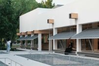 Atelier Wen’Arch ließen fast das gesamte Gebäude auf die Tragstruktur zurückbauen, um im Inneren großzügige Raumzusammenhänge herzustellen und zugleich neue Außenbezüge zu schaffen. Die alte Vorfahrt dient in Form einer geschwungenen Fußgängerbrücke als neuer Zugang. Das Erdgeschoss wurde nach allen Seiten geöffnet und mit Fensterbändern ausgestattet, die sich bei warmem Wetter ganz zur Seite falten lassen. Schräge Metallplatten vor den Fenstern fungieren nun als Sonnenschutz. Sie wirken auf den ersten Blick wie bewegliche Elemente und verleihen dem Haus den Anschein einer geöffneten Maschine. Es handelt sich aber um fest montierte Elemente.