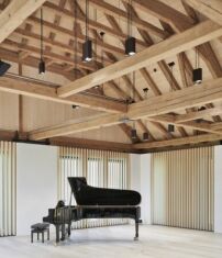 Die als sogenannter Pfeilerstall errichtete frühere Scheune springt etwas zurück und bildet einen Vorplatz aus. Das erste Obergeschoss mit seinem offenen Dachtragwerk bot adäquate Voraussetzungen für die Nutzung als Konzertsaal und wurde entsprechend adaptiert. Der helle, hohe Raum bietet Platz für bis zu 120 Personen. An der Fassade interpretierten die Architekt*innen die historischen Holzverschalungen mit verstellbaren Holzlamellen neu. So erhielt das Haus ein introvertiertes Erscheinungsbild.