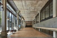 Die Architekt*innen ergänzten die oberen Etagen um ein zusätzliches Stockwerk und erweiterten das Gebäude an der Ostfassade, wodurch eine zusätzliche Fläche von 11.000 Quadratmetern geschaffen wurde. Dabei griffen sie die bestehende Architektursprache mit ihren terrassierten Schichten auf – gestützt durch alternative Entwürfe Lasduns, die AHMM in den Archiven des Gebäudes und des Architekten fanden. Um die Fensterflächen zu vergrößern und mehr Tageslicht in die darunterliegenden Etagen zu bringen, demontierten sie die markanten Betonelemente an den Gebäudekanten, bereiteten sie auf und setzten sie rund 50 Zentimeter höher wieder ein.