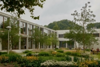 Das östliche Gebäude beschreibt im Grundriss eine asymmetrische U-Form, den Innenhof nahmen früher Stellplätze ein. Diese ersetzte man in Zusammenarbeit mit Landschaftsarchitekt Tomas Degenaar (Amsterdam) durch einen parkartigen Garten. Vor die nördlich angrenzende, nun großflächig geöffnete Fassade stellten die Planer*innen eine zweistöckige Kolonnade, die über die Straße hinweg bis zum zweiten Bau der Schule reicht. Oben dient sie als verglaster Flur, unten bildet sie eine leichte Schwelle zwischen außen und innen. Die Baukosten betragen rund 12,1 Millionen Euro bei einer Bruttogrundfläche von 15.700 Quadratmetern. (mh)
