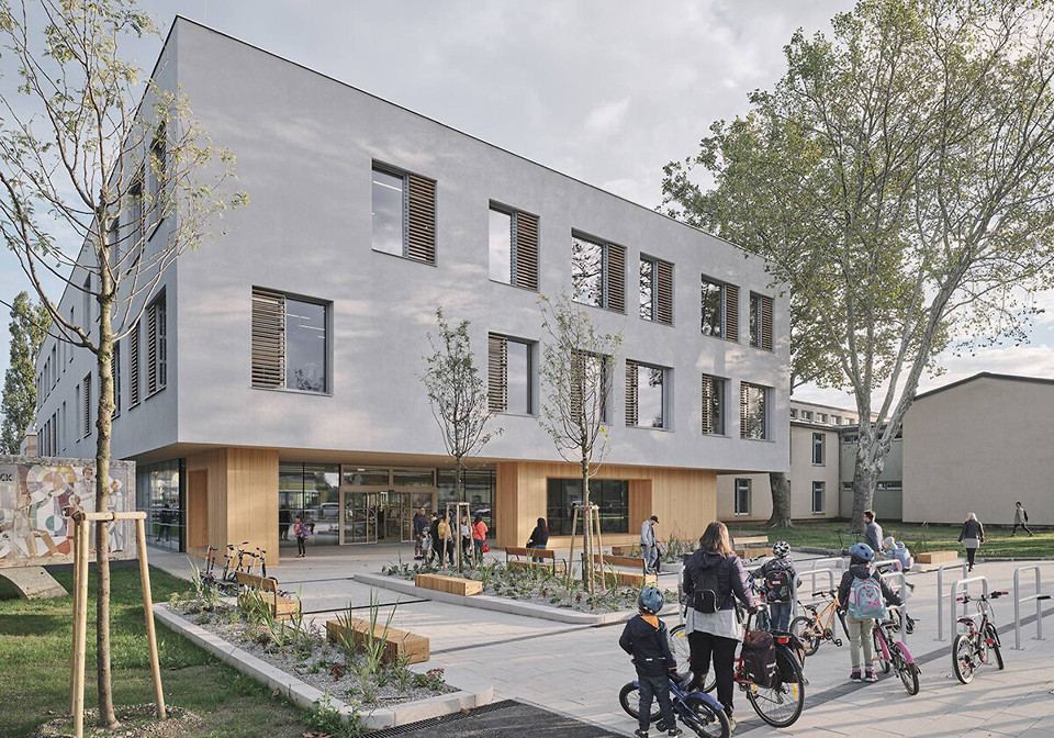 Der denkmalgeschützte Krankenhausbau stammt von Alfred Mautner und Johann Rothmüller. Errichtet wurde er in den 1920er Jahren als Entbindungsanstalt. Heute dient er als Gymnasium, und zwar zunächst als Ausweichquartier für eine Schule, die derzeit modernisiert wird. Später folgt eine Verwendung als regulärer neuer Schulstandort. Platz ist für 23 Stammklassen, alle ergänzenden Fachräume und weitere Einrichtungen wie Speisesaal und Bibliothek. In räumlicher Hinsicht am einschneidendsten war dabei die Entscheidung der Architekt*innen, das Gelände zum Garten hin abzusenken. Dadurch ließ sich der ehemalige Keller in ein Gartengeschoss verwandeln. Mit diesem Konzept konnten sich Franz&Sue 2021 in einem offenen Verhandlungsverfahren durchsetzen. Die Außenraumgestaltung stammt von idealice Landschaftsarchitektur (Wien).