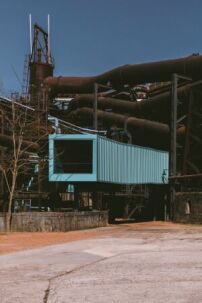 Darüber hinaus ist der Bau Ausgangspunkt eines als Promenade architecturale inszenierten Weges durch den Bestand, der zum bereits existierenden Wegenetz durch das Weltkulturerbe hinleitet. Über eine leicht ansteigende Rampe werden die Besucher*innen vom Erdgeschoss durch das Pumpenhaus bis zur Gebläsehalle geführt, wo sich Wechselausstellungsflächen befinden. Mit ihrer hellgrünen Farbe setzt sich die Konstruktion klar vom Rostrot der alten Industrieanlagen ab und wird so klar als zeitgenössisches Element hervorgehoben.