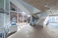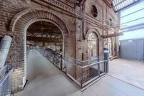 benachbarten Pumpenhauses erlebbar zu machen, intervenierten Duncan McCauley sehr zurückhaltend in die historische Substanz. Den räumlichen Auftakt bildet die großzügige Erdgeschosshalle mit zwei erhaltenen Kranbahnen. Sie wurde weitestgehend freigehalten, damit Maßstab und Materialität authentisch bleiben. Im hinteren, bisher geschlossenen Gebäudeabschnitt positionierten die Planer*innen die neue Haupterschließung. Eine breite Treppe bildet den Auftakt zum Museumsrundgang. Um die oberen Ebenen des Wasserhochbehälters barrierefrei zu erschließen, wurde ein 22-Personen-Aufzug eingefügt. Als Nettonutzfläche ergeben sich 2.800 Quadratmeter.