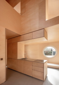 Der Bestandsbau, bestehend aus einem Sockelbau, der als Garage genutzt wurde und einer darüber liegenden Holzkonstruktion wurde komplett entkernt und neu gestaltet. Innen ließen die Architekten das Haus vollständig mit Holz auskleiden. Kontrastierend zum Äußeren wird das Innere also als ein Ganzes begriffen. Darüber hinaus vermittelt diese Materialisierung einen gewissen Bühnenbildcharakter. Wie in den Filmszenen sollen einzelne Situationen in Mr. Barrett's House die Beziehungen zwischen den Bewohnern beeinflussen, schreibt Zamarbide. Der Wohnraum ist auf insgesamt nur 70 Quadratmeter organisiert. Im Erdgeschoss befinden sich Küche, Essnische und Wohnzimmer. Im oberen Geschoss liegen zwei Schlafräume. Es gibt wenig Platz für ein Drama. Hoffentlich dient das Haus seinen Bewohnern nur als Räumlichkeiten für deren The Real Life. (eb)