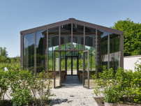 Für die Orangerie griffen sie auf eine gänzlich andere Architektursprache zurück. Hier setzten sie schwarzen Stahl und vertikale Glasstreifen, aus dem sie die klare und im besten Sinne einfache Form eines Hauses bildeten, das eine fast schon sakrale Atmosphäre verbreitet – wie eine kleine Kapelle. Doch so gediegen dieser neu geschaffene Veranstaltungsraum auch ist, überzeugt die Remise doch mehr. Die grundsätzliche Haltung des Hauses ist zwar stichhaltig, die Detaillierung scheint aber nicht ganz so gelungen. (gh)