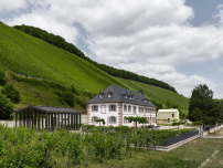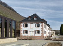 Um diese zeitgenössischen Funktionen rund um das Thema Wein in das barocke Gutshaus integrieren zu können, entschieden sich die verantwortlichen Architekten des Berliner Büros von Max Dudler für zwei kleine, kompakte Neubauten. Diese stellten sie in gebührenden Abstand zum Altbau, der 1740 im Auftrag des Prämonstratenserklosters Wadgassen errichtet worden war. Aus dem barocken Gutshaus wurde so ein Ensemble, das sich auf einem länglichen Streifen Land zwischen Saar, Straße, Bahnlinie und steil ansteigendem Weinberg erstreckt. Der Altbau wurde behutsam saniert und möglichst wenig verändert.