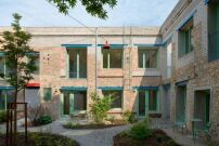 Im engen Hof schufen die Architekt*innen einen offenen Gemeinschaftsbereich mit Kiesflächen, farblich passenden Gartenmöbeln und breiten Fensterbänke, die auch als Sitzplätze genutzt werden können. Innen wird das Farbkonzept weitergeführt: blaue Kücheneinbauten und Geländer, rote Vorhänge und grüne Pendelleuchten werden hier mit Holzträgern, Eichenparkett und Steinzeugfliesen kombiniert. (dsm)