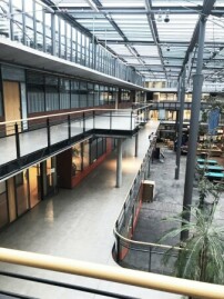 Wirklich erfolgreich war das Projekt jedoch nie. Vielleicht war es seiner Zeit voraus? Vielleicht lag es auch einfach etwas zu weit abseits? Der projektierte, lebhafte Wochenmarkt im großen, lichtdurchfluteten Atrium hatte jedenfalls keine Chance. Anstelle attraktiver Einkaufsmöglichkeiten wurden beispielsweise einige Flächen vom Land genutzt, um hier thematisch halbwegs passende Abteilungen der Verwaltung unterzubringen. Nun steht der Umbau der Gewerbeimmobilie zu einer Schule für circa 1.500 Schüler*innen an. Damit wird Haus ein zweites Mal Vorreiter, dieses Mal hoffentlich erfolgreicher.