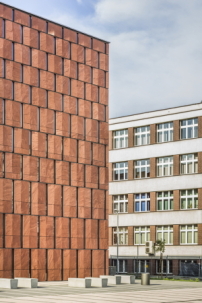 Das Wissenschaftliches Informationszentrum und Akademische Bibliothek genannte Bauwerk, auf polnisch mit CINiBA abgekürzt, ist vor zwei Wochen eröffnet worden. Es enthält inzwischen auch den Bestand der Wirtschaftshochschule. Der Neubau soll den Anker für die geplante räumliche Weiterentwicklung des Universitätscampus' nordwestlich der Innenstadt von Kattowitz bilden. Es markiert die Kreuzung der Nord-Süd-Achse und der Ost-West-Achse dieses Campus'. Ein zentraler Universitätsplatz zu Füßen der Bibliothek, Forum genannt, bildet einen Treffpunkt, der sich zum dreigeschossigen Atrium der Bibliothek öffnet.