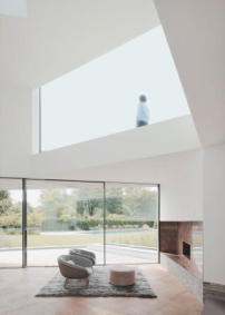 Im Inneren ist die Villa als L-Form um das doppelgeschossige Wohnzimmer organisiert, das durch eine leichte Absenkung auf eine Bodenmulde im großen Garten reagiert. Durch diese Absenkung entstand ein repräsentativer, sieben Meter hoher und lichtdurchfluteter Raum. Einen atmosphärischen Gegenpol im Erdgeschoss setzt die in Eiche gehaltene, introvertierte Bibliothek. Hochwertige Materialien und hohe Ausführungsqualität prägen die Innenausstattung. Es enstanden 303 Quadratmeter Wohnfläche bei 770 Quadratmetern Bruttogrundfläche, nicht zuletzt aufgrund eines sehr großzügigen Untergeschosses. (tl)