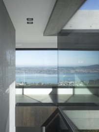 An der Nordfassade spielt die (mit 333 Quadratmetern sehr großzügige) Villa mit Geschlossenheit und Offenheit und macht den unterschiedlichen Grad der Privatheit der Räume dahinter ablesbar. Die Hauptrolle spielt hier aber eindeutig der Blick auf den See.