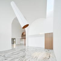 „Von oben geneigt, von unten gewölbt als auch von den Seiten verdreht“ – etwas kompliziert klingt die Beschreibung des Daches der Villa, dem eine Schlüsselrolle im Narrativ des Entwurfs zufällt. Angelehnt an den Schrein und die ortstypischen Kreuzgewölbe der Gegend entwarfen die Architekten eine expressive, zwischen Giebel und Gewölbe changierende Dachform. Richtung Westen, dem Meer entgegen, steigt diese steil an. Untergebracht ist das Raumprogramm des herrschaftlichen Hauses in sechs nebeneinanderliegenden Gewölbeschiffen: Auf einer quadratischen Grundfläche von 30 mal 30 Metern finden sich im Erdgeschoss Gesellschaftsräume wie Küche, Salon, Wohn- und Esszimmer, während sich die privaten Räume im oberen Stockwerk befinden. Die skulpturale Verformung der sich kreuzenden Gewölbe setzt den Innenraum extravagant in Szene, hinzu kommen Böden aus hellem und dunklem Marmor und weiß getünchte Wände, die für das hier offensichtlich nötige Luxusfeeling sorgen.