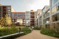 Trotzdem bleibt auch hier eine gewisse Kohärenz erkennbar – Klinker, Aluminium und Cortenstahl finden sich nicht nur an Fassaden wieder, sondern fließen auch in die Außenraumgestaltung des Rotterdamer Landschaftsarchitekturbüros ZUS ein. Den dramaturgischen Höhepunkt bildet eine rostrote Freitreppe, über die das sogenannte Maasfenster betreten werden kann. Diese Terrasse bietet einen weiten Ausblick auf den breiten Fluss, was besser funktioniert, als beim benachbarten Holzhochhaus SAWA, das ein ähnliches bauliches Motiv zeigt. Dank verspiegelter Decken ist das Wasser sogar ohne Treppensteigen direkt vom Innenhof aus erkennbar. (tg)
