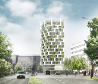 Das ebenfalls mit einem 2. Preis ausgezeichnete Projekt von Worschech Architekten zeigt hingegen eine konventionellere Architektur mit – laut Jury – „offenbar bewusst enger Anlehnung an den Formen- und Materialkanon des Geschosswohnungsbaus“. Mit der Begrünung tut sich dieser Ansatz allerdings deutlich schwerer – hier muss man spontan eher an ungepflegte Blumenkästen als an einen vertikalen Wald denken. Im Gegensatz zum anderen, gleichrangig platzierten Entwurf arbeitet das Büro jedoch mit zwei Wohntürmen, was stadträumlich wahrscheinlich die spannendere Lösung ist.