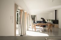 Die vordergründige Trivialität der Raumkonfiguration täuscht allerdings, denn den Architekten gelingt es, durch einige wenige, aber präzise Eingriffe dem Haus Vielschichtigkeit und Tiefe zu verleihen. Da wären zum einen mehrere Holzeinbauten wie die Sitzbank im Wohnzimmer oder die Holzregale an der Treppe, die mit ihrer Höhenabstufung zwischen Eingangs- und Wohnbereich vermitteln. Und da wären zum anderen die Schiebetüren, mit denen sich das Bad und die beiden Schlafzimmer zu einer durchgehenden Raumflucht öffnen lassen.