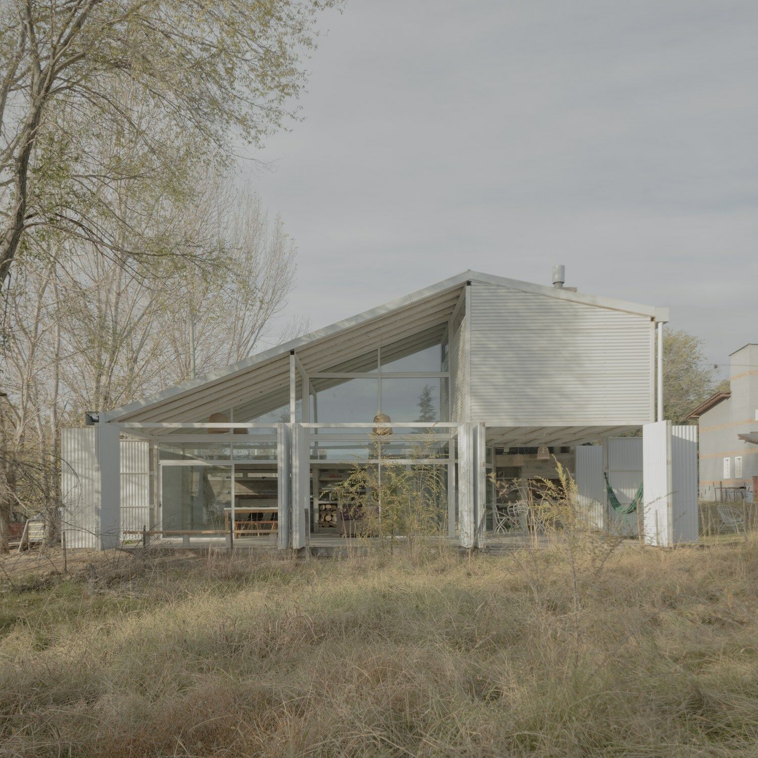 Das übrige Haus ist letztlich ein offenes, weißes Stahlgerüst. Lediglich ein kleiner Teil ist durch Vollverglasungen thermisch abgeschlossen. Ansonsten lässt sich die Veranda mit großen Falttüren komplett öffnen oder schließen – je nachdem, ob die Hausherren anwesend sind oder nicht, wie die Architekt*innen schreiben. Das Auto kann man hier natürlich auch verstecken. Unter dem langgezogenen Holz- und Wellblechdach befinden sich im Obergeschoss einzig das Schlafzimmer samt Galerie.