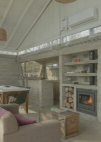 Womit wir bei der Casa Lelis von vbrügg wären. Die Architekt*innen griffen eine in der Bergregion verbreitete Bauweise auf. Vor einem massiven Gebäudekern aus dicken Wänden liegen dabei offene Veranden. So bleiben die Innenräume im Sommer kühl und verschattet, während sie im Winter ausreichend isoliert sind. In der Übersetzung von Valentín Brügger und seinem Team dient der massive Part als Serviceblock, in dem sich Küche, Bäder und Treppenhaus befinden – alles in Beton ausgeführt.