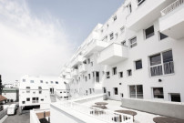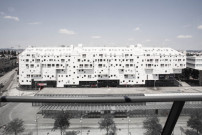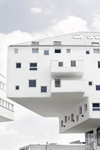 Zum Charakter der Anlage trägt die auffällige, frei schwebende Auskragung an der nördlichen Seite bei. Der Bau erstreckt sich über 110 Meter entlang einer Verkehrsachse mit einer U-Bahnstation und Busspuren, wirkt von der Seite aber recht schmal. Während die Architekten zur Straße hin eher mit Erkern gearbeitet haben, lagern sie an die gegenüberliegende Fassade Balkone, Loggien und Terrassen an.