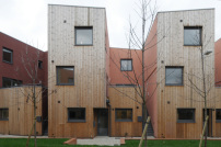 Die enge Nachbarschaft war eine Herausforderung an den Entwurf. Der Freiraum zwischen den Reihen ist gegen die Nachbarschaft abgeschirmt. Die rückwärtigen Gärten stoßen an die der existierenden Bebauung; die Architekten haben die Fensteröffnungen der hinteren Fassade so platziert, dass neugierige Blicke von gegenüber nicht ohne Weiteres möglich sind. Dennoch war es ihnen wichtig, das neue Ensemble nicht gegen den Stadtteil hermetisch abzuschließen, sondern einen funktionierenden Baustein in die bestehende Struktur einzufügen.