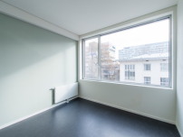 Für rund 20 Euro Kaltmiete kann man in Frankfurt jetzt in eines der herausragenden Denkmäler der Nachkriegsarchitektur einziehen. Die RMW Wohnungsgesellschaft Frankfurt hat Ferdinand Kramers Philosophicum auf dem ehemaligen Universitätsgelände in Bockenheim zum Apartmenthaus umgebaut, es beherbergt nun 238 Wohnungen von 21 bis 41 Quadratmetern Größe und wird als „The Flag Bockenheim“ vermarktet. Verantwortlich für den Umbau des Institutsgebäudes der geisteswissenschaftlichen Fakultäten ist das Frankfurter Büro Stefan Forster Architekten. Forster hat die schmale Hochhausscheibe mit dem außenliegenden Stahlskelett nicht nur saniert, sondern auch um einen Anbau zur Gräfstraße ergänzt. Die neue, fünfgeschossige Erweiterung nimmt Höhe und Bauflucht der umgebenden Vorkriegsaltbauten auf und umfasst den von der Straße zurückgesetzten Altbau teilweise.
