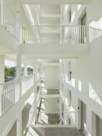 Die vorgelagerten privaten Gärten gehören zu den in den beiden unteren Obergeschossen liegenden Wohnungen, die von hier aus auch über Außentreppen erschlossen werden. Ab dem dritten Obergeschoss sind die Apartments über ein offenes Treppenhaus an der Gebäuderückseite zu erreichen. Es gliedert sich in einen gemeinsamen Laubengang, von dem kleinere private Wegbereiche zu den Wohnungstüren abzweigen.