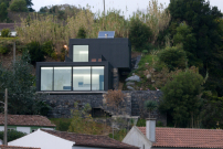Zusätzlich interessant wird das sehr steile Grundstück durch vorhandene Ruinen. Die Architekten wollten deren „physische Leere“ füllen, indem sie die Außenmauern restaurierten und das neue Haus obenauf setzten. So bleibt die Identität des Orts und die Erinnerung erhalten und wird zugleich mit Heutigem verbunden. Denn das Gebäude spricht eine eigene Sprache: Die strengen, versetzt übereinander gestapelten Kuben sind außen schwarz verkleidet; das Innere ist im Gegensatz dazu strahlendweiß und –  das wiederum eine Parallele zur äußeren Erscheinung – minimalistisch gestaltet. Verschieden große Fensteröffnungen rahmen die Blicke in die Landschaft; die zum Meer orientierte Seite ist raumhoch verglast. Und der Blick aus der Badewanne durch eine Panoramafensterscheibe dürfte so rasch nicht zu toppen sein.