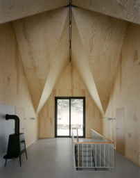 Darüber ließen sich auch Teile der Firstwände erhalten, die ursprüngliche Dachform deutete Voigt jedoch zum offenen Kreuzgiebel um. Über der elterlichen Wohnung, die um den zentralen Giebelraum angeordnet ist, ließen sich so noch zwei Schlafkammern unterbringen. Das Obergeschoss wurde vollständig in regional geschlagenem Nadelholz errichtet. Entsprechend der Analogie eines Baumstammes fand für die Fassade dunkle Borke Verwendung, der Innenraum ist mit hellem Sperrholz ausgekleidet.