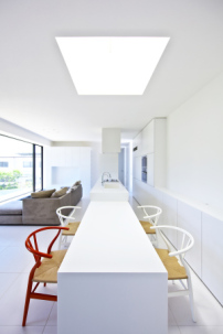 An einer Straße gelegen, wird das 146 Quadratmeter große Gebäude von aufdringlichem Geräuschpegel durch eine abgerundete Betonmauer geschützt. Innerhalb der Mauer gelingt es den Architekten, einen ruhigen Ort zu schaffen, der sowohl versteckte schummrige Ecken als auch offene Bereiche aufweist. In der unteren Ebene platzieren sie insgesamt drei ungleich große Betonvolumen: Die Garage bleibt freistehend, während die Galerie und das Studio eine zweite Ebene über sich tragen, in der das eigentliche Wohnen stattfindet.