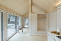 Die Innenwände und Einbauten bestehen aus teils transparent, teils weiß lackierten Dreischichtplatten. Die Funktionen reihen sich in dem schmalen Baukörper der Länge nach auf: Küche, Bad, Schlafzimmer im Nordosten, der Wohnbereich sowie ein weiteres Zimmer im Südwesten. (sbm)