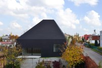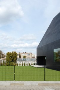 Dyrda Fikus Architekci aus Kattowitz klingen nicht begeistert, wenn sie vom eklektischen Charakter der Einfamilienhaussiedlung in Lubliniec sprechen: Das „stilistische Chaos“ schreiben sie einer „nationalen Tendenz“ zu, in der das Haus „zur Manifestation der individuellen Neigungen und des Geschmacks der einzelnen Eigentümer“ wird. Deshalb entschied sich das Büro für ein Kontrastprogramm und platzierte mitten in die vermeintliche Idylle hinein einen dunklen, abweisenden Neubau.