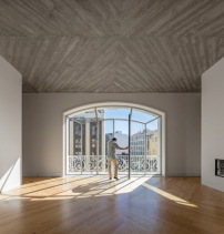 Die flächige Materialität aus Holz und Sichtbeton mit geweißten Wänden ergänzt die bourgoise Substanz um zeitgenössischen Chic. Die Holzschalung der Betondecken spiegelt die diagonale Struktur des Parketts. Den Architekten gelang es, mit Treppenhaus und Lichthof die Rundungen der ursprünglichen Gestaltung aufzunehmen und gleichzeitig eine eigenständige Architektur zu schaffen. Nicht zuletzt die schön detaillierten Einbaumöbel lassen das Ergebnis genau so edel wirken wie den prachtvollen Ursprungsbau. Nun wünscht man sich, dass Bauherrn und Architekten in der Straße sich das Projekt zum Beispiel nehmen: Besonders die vom Brand in Mitleidenschaft gezogenen Nachbarn des Hauses warten ebenfalls auf eine anspruchsvolle Sanierung. (dd)