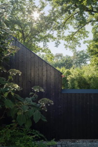 Die gewissenhafte Gestaltung des Innenraums wurde auch an der Holzfassade fortgeführt. Um auf chemische Behandlung gänzlich verzichten zu können wurde das Holz nach japanischer Tradition Shou Sugi Ban verkohlt, womit sie wasserabweisend versiegelt und langfristig vor Pilzbefall geschützt sind. (kg)