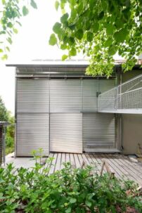 Im aktuellen Zustand sind die geschlossenen Flächen wie bei früheren Projekten schon in hinterlüftetes Wellblech gehüllt. Die offene Südseite bekam eine zweite Schicht, die für anpassbaren Sonnenschutz sorgt. In paradigmatischer Weise hatten Aretz Dürr dieses Prinzip bei ihrem Anbau in Biberach umgesetzt. Angesichts der damaligen Radikalität ging das Büro mit dem Aachener Projekt fast schon locker um. An der Giebelseite befindet sich ein einzelnes Fenster! (mh)